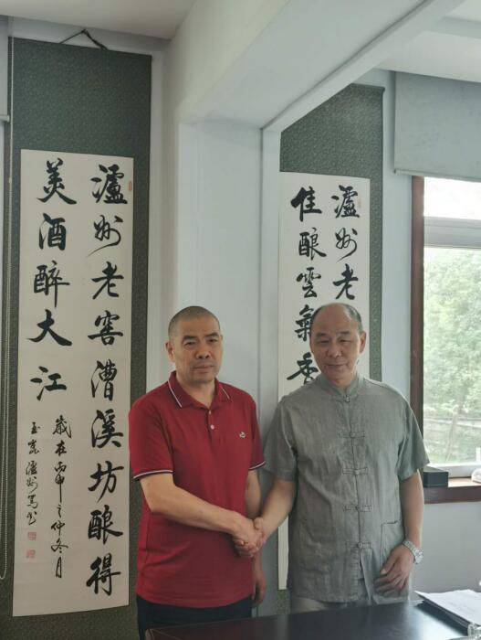 上海靈壁商會會長王德發(fā)先生(左)蒞臨公司考察合作。與公司釀酒大師瀘州濃香老窖傳統技藝第21代傳人陳靖余(右)合影
