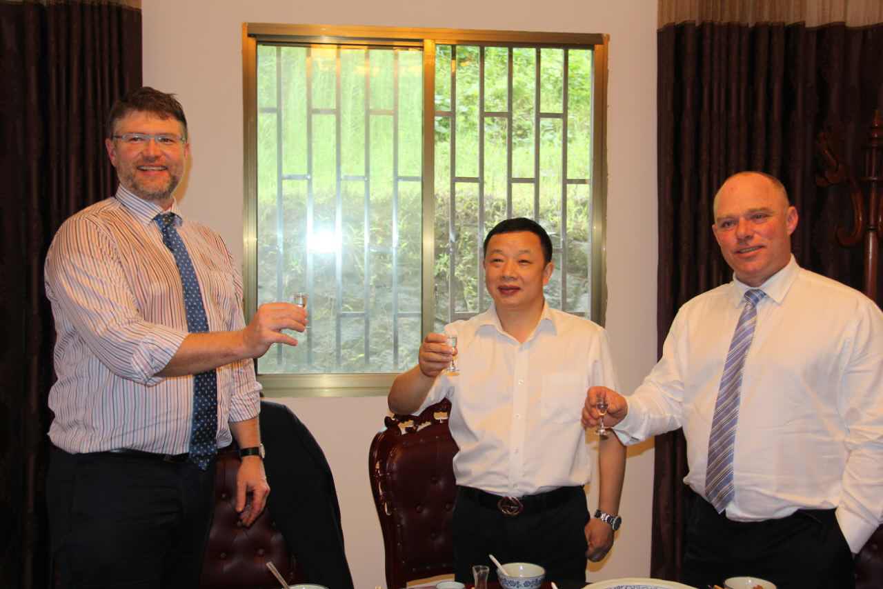 勁牌酒業(yè)股份有限公司董事長吳少勛(左三)等與公司董事長魏云飛(右三)在瀘州鑫霸實(shí)業(yè)公司合影